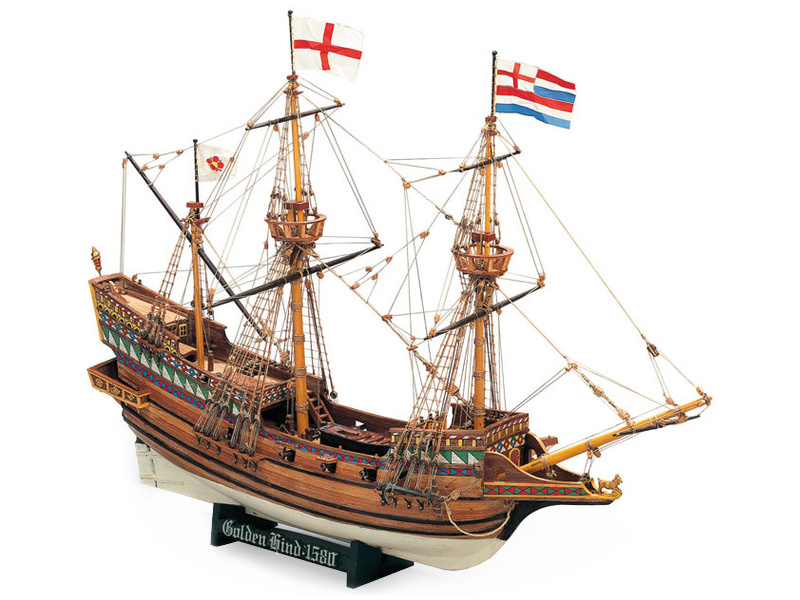 Stavebnice neplovoucího modelu MAMOLI Golden Hind v měřítku 1:53 z roku 1577. Loď použil Sir Francis Drake při jeho plavbě kolem světa v roce 1577. Loď měla délku trupu cca 25 metrů a výtlak 120tun. Výzbroj lodi tvořilo 18 děl. Model má délku 495mm. V balení jsou dřevěné díly, lišty a množství kování, lanoví, plány atd.