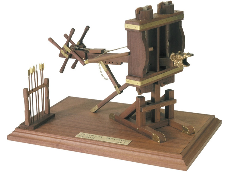 Stavebnice modelu Byzantského katapultu v měřítku 1:17. Model vychází z původní kresby s 10. století. Zbraň střílela šípy s výbornou přesností a průrazností. Podobné konstrukce katapultů znali Římané již v roce 300př. nl. Konstrukce se skládá z předem nařezaných dřevěných dílů a kovových litých ozdob.