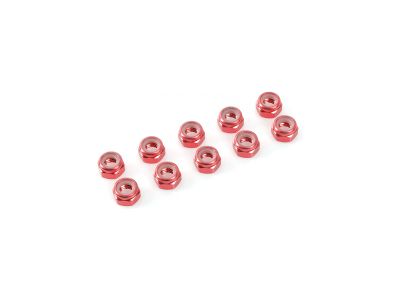 Samojistná hliníková matice M4 červeně eloxovaná. Balení obsahuje 10 ks.