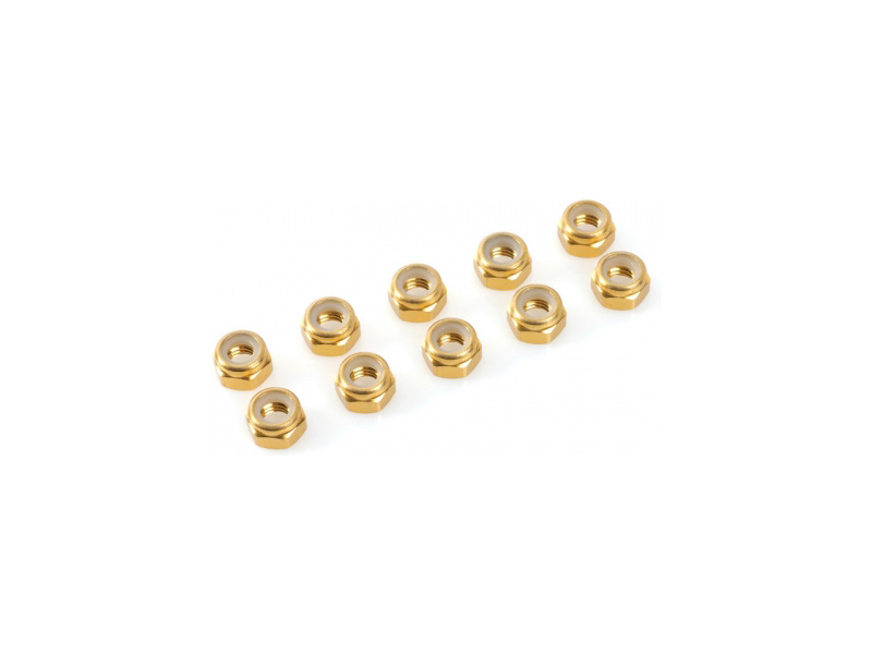 Samojistná hliníková matice M4 zlatě eloxovaná. Balení obsahuje 10 ks.