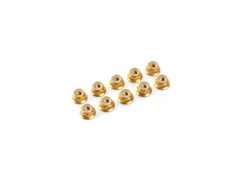 Samojistná hliníková matice M3 s přírubou zlatě eloxovaná. Balení obsahuje 10 ks.
