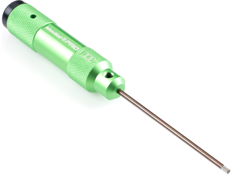 Kvalitní CNC imbus šroubovák Medial Pro o velikosti 2.5 mm má hliníkovou rukojeť o délce 97 mm a průměru 21 mm s gumovou opěrkou a dřík o délce 83 mm . Atraktivní balení v plastové krabičce.