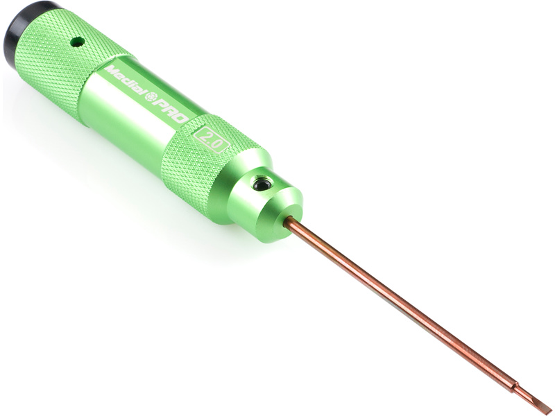 Kvalitní CNC plochý šroubovák Medial Pro o velikosti 2.0 mm má hliníkovou rukojeť o délce 97 mm, průměru 21 mm s gumovou opěrkou a dřík o délce 83 mm. Atraktivní balení v plastové krabičce.