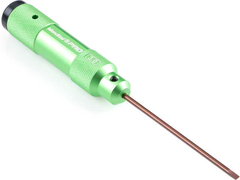 Kvalitní CNC plochý šroubovák Medial Pro o velikosti 3.0 mm má hliníkovou rukojeť o délce 97 mm, průměru 21 mm s gumovou opěrkou a dřík o délce 83 mm. Atraktivní balení v plastové krabičce.