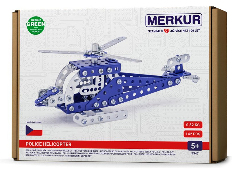 Stavebnice Merkur - Policejní vrtulník. V balení najdete podrobný návod, Merkur sadu nářadí a unikátní Merkur díly. Merkur díly jsou univerzální a tak vás neomezí v jakékoli modifikaci a nápadu. Stavebnici tak můžete sestavit podle návodu nebo podle svých představ.