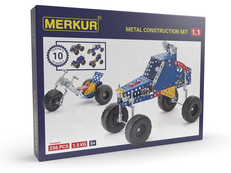 Chcete si postavit vlastní terénní vozidla, která dokážou překonávat různé překážky a to s lehkostí sobě vlastní? S touto speciální stavebnicí máte jedinečnou šanci! Právě v této stavebnici byly totiž poprvé použity speciální pružiny k odpružení kol, díky kterým váš model překoná téměř vše, co se mu postaví do cesty. Vyzkoušejte si svou zručnost a v zápalu hry se přesvědčte o tom, s jakou lehkostí se vámi postavené modely vypořádají s překážkami. S MERKUR 1.1. stavebnicí vozidel můžete sestavit až 10 různých modelů. Stavebnice obsahuje 256 dílků včetně návodu a nářadí. Vhodné i pro děti, které s Merkurem začínají. Se sestavenými modely si lze hrát, jsou velmi odolné.