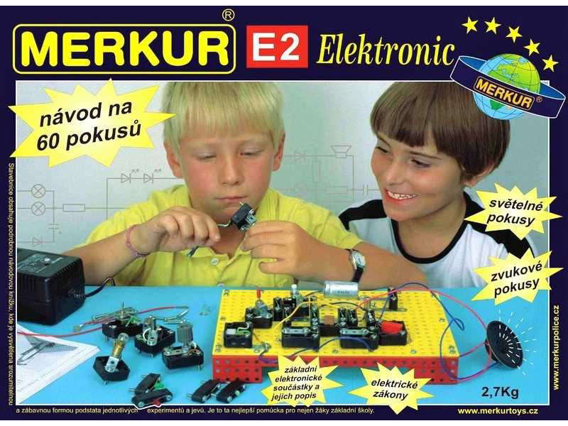 Se stavebnicí Merkur elektronik E2 je ta nejlepší pomůcka pro žáky základní školy. Můžeme vyzkoušet 60 pokusů z elektroniky - např. elektrický obvod, pokusy s rezistory, kondenzátory a diodami atd.