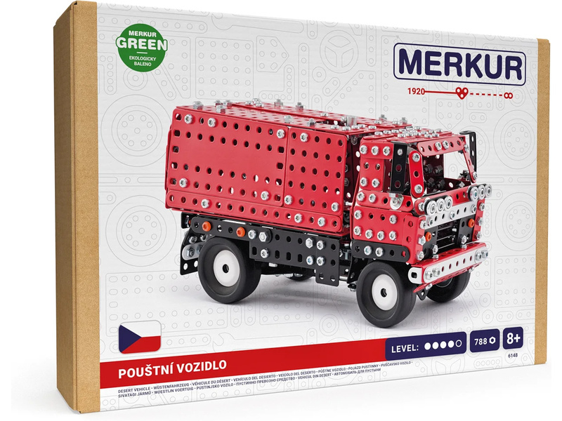 Klasická česká stavebnice Merkur - Pouštní vozidlo 4x4. Ze stavebnice lze sestavit dvě varianty kovového modelu auta – se zakrytou i otevřenou korbou. Merkur díly jsou univerzální a tak vás neomezí v jakékoli modifikaci a nápadu. Stavebnici tak můžete sestavit podle návodu nebo podle svých představ.