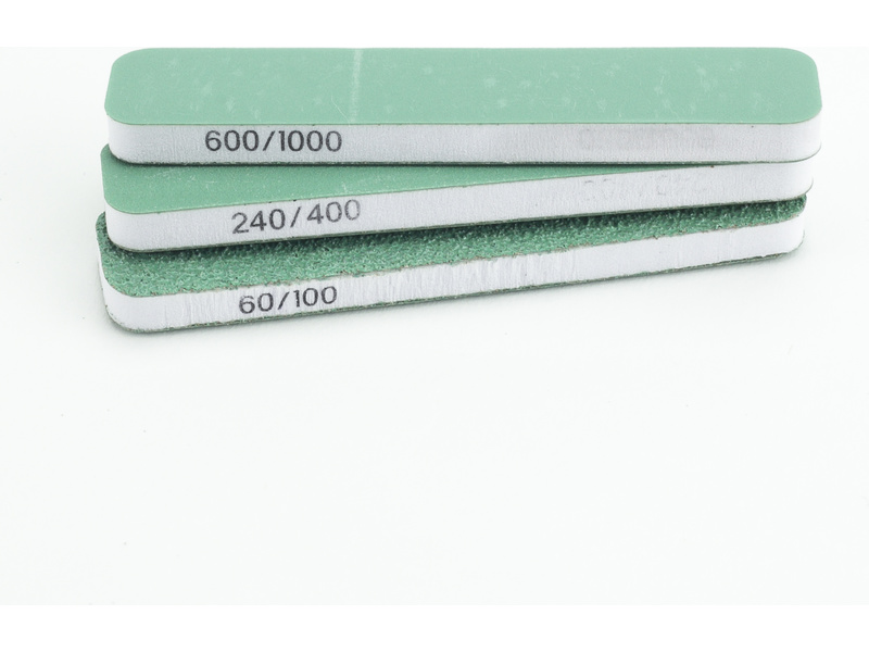 V balení jsou 3 ks flexibilních oboustranných brousítek 90 x 19 x 6 mm, na každé straně jinou hrubostí - hrubé P60/P100, střední P240/P400 a jemné P600/P1000. Tvarem se přizpůsobí i zaobleným plochám.