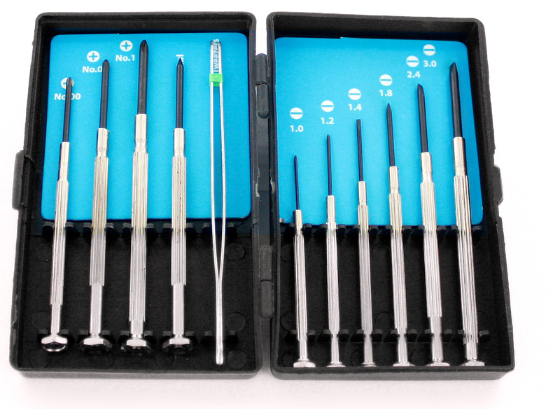 Modelcraft hodinářské šroubováky (sada 10ks) využijete pro drobný spojovací materiál. Ploché šroubováky 1.0, 1.2, 1.4, 1.8, 2.4, 3.0mm, křížové Phillips 00,0,1, hrot a pinzeta, vše v plastové kazetě. Délka rukojeti 50 - 70 mm, průměr 3 - 4 mm, délka dříku 20 - 26 mm.