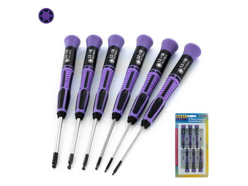 Modelcraft imbus šroubováky s kuličkou (sada 6ks), z nerezové oceli s pracovní částí s černou povrchovou úpravou z chromové oceli. Dříky mají stejný průměr jak rozměr šroubováku, délka dříku je 50 mm. Rozměry: 1.3 mm, 1.5 mm, 2.0 mm, 2.5 mm, 3.0 mm, 3.2 mm. Plastové ručky s otočnou hlavicí o délce 100 mm a průměru 12 mm.
