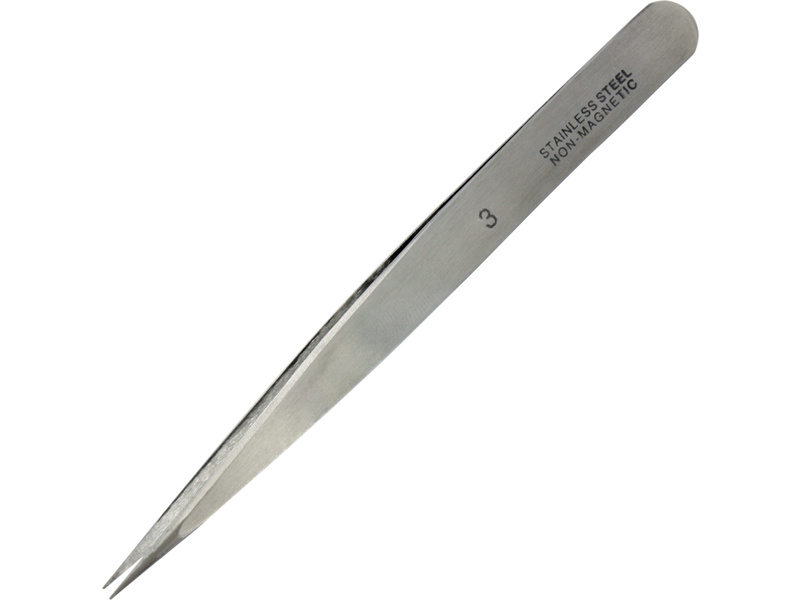 Modelcraft nerezová pinzeta úzká s tenkou špičkou pro přesné držení a umístění malých až mikroskopických dílů a součástí. Odolává kyselinám, je nemagnetická. Délka 120mm, šířka 10mm, hmotnost 21g.