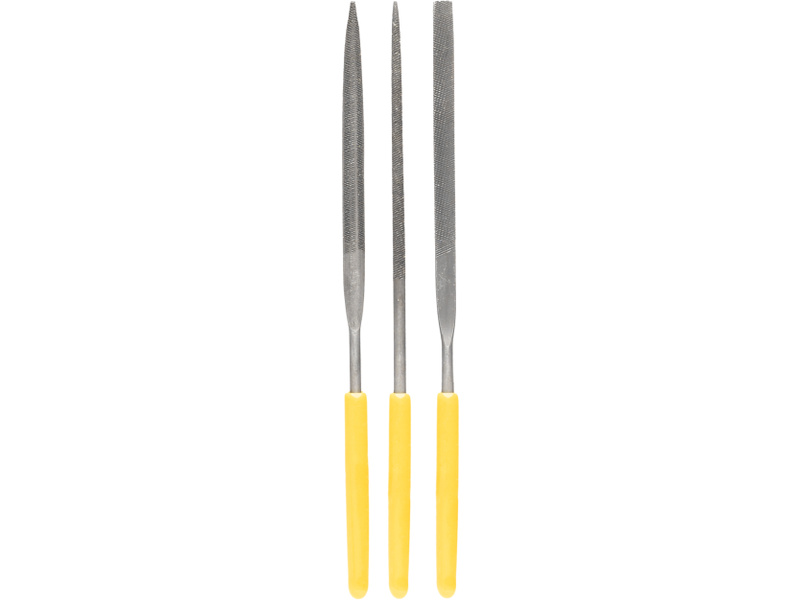 Sada precizních mikro pilníků Modelcraft - jehlové s gumovou rukojetí, pro přesnou práci. Obsahuje tři různé profily: plochý, půlkulatý a kulatý pro použití na různých tvarech. Ocelové kalené pracovní části. Délka 100 mm.