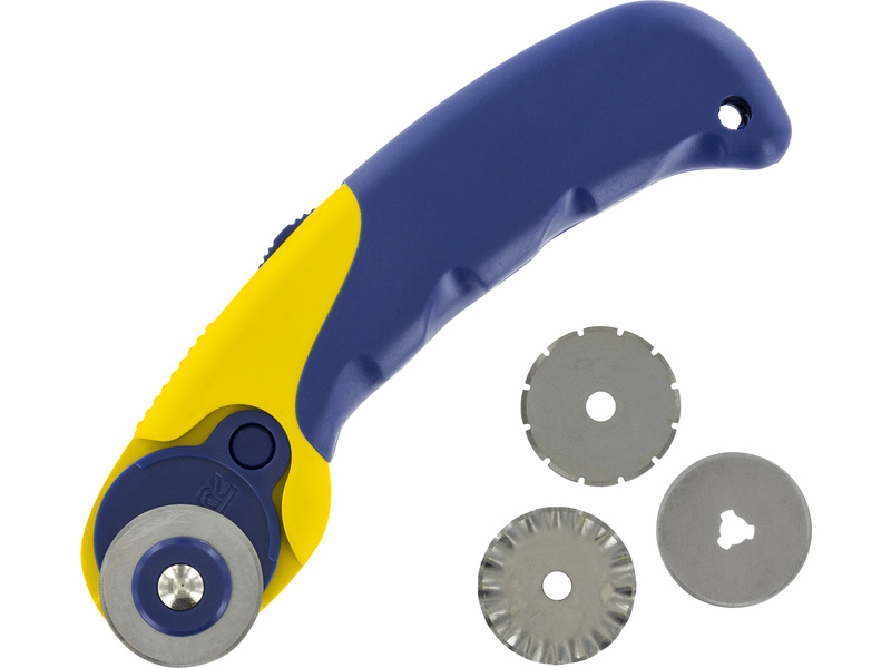 Modelcraft rotační nůž 45mm, 3ks řezací kolečka je sada pro pohodlné řezání tkaniny, kartonu, papíru, kůže, vinilu apod. K dispozici jsou náhradní kolečka s různými tvary jako Standard, Přerušovaný a Vlnitý. Robusní rukojeť pro pevné držení a silný přítlak. Rozměry 170mm x 58mm x 23mm, hmotnost 89g.