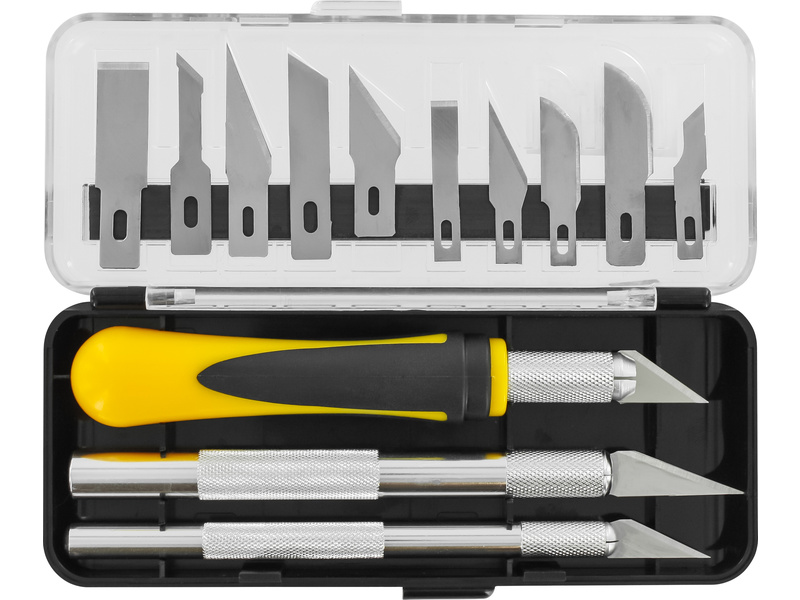 Modelcraft sada 3 nožů s 13 čepelemi se skládá ze 3 držáků velikostí #1 malý, #2 střední a #5 velký a 13 různých čepelí. Použití pro jemné rovné i oblé řezy. Pro řemeslníky, modeláře a profesionály. Sada je uložena v praktickém pouzdru, čepele na magnetickém pásku.