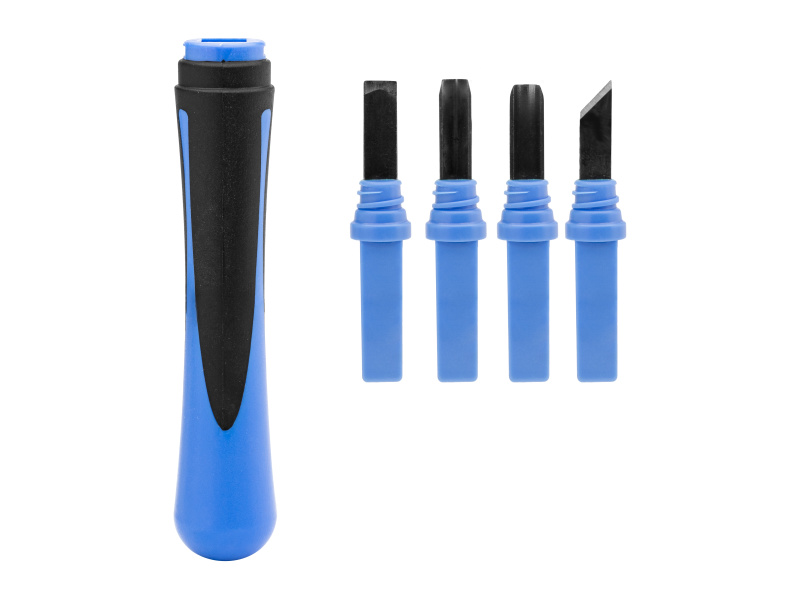 Balení obsahuje rukojeť a 4 dláta (šikmé dláto, V-dláto, ploché dláto, duté dláto).
