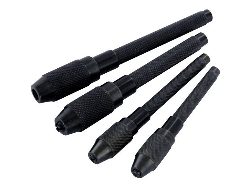 Ruční Modelcraft sada 4ks sklíčidel pro vrtáky o průměru 0,1mm - 4,8mm se používá se k ručnímu vrtání malých a nejmenších otvorů do plastu, dřeva atd. s velkou mírou kontroly a přesností. Má vroubkované válcové tělo pro pohodlné držení prsty, sklíčidla se dotahují prsty, není určeno pro strojní použití.