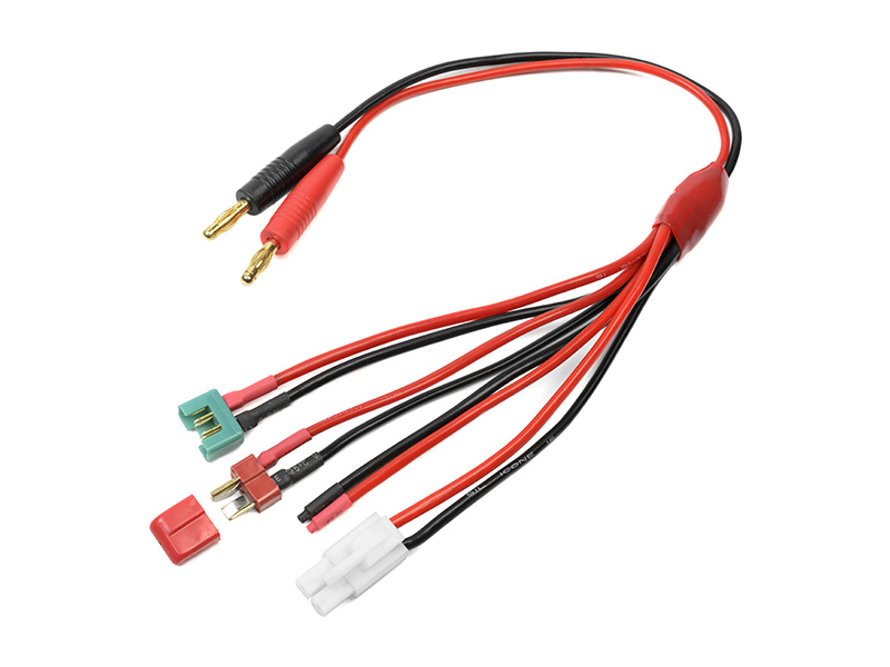 Nabíjecí kabel s banánky 4 mm a paralelně zapojenými konektory - Tamyia, Deans, MPX (přistroj) a pár volných kabelů. Kabel má průřez 16AWG.