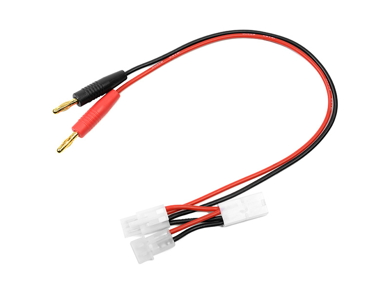 Nabíjecí kabel s banánky 4 mm paralelně zapojenými konektory: Tamiya baterie (samec) / Tamiya přístroj (samec) / AMP samice, kabel 16AWG