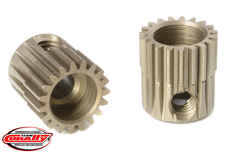 Krátké provedení, materiál tvrzená ocel, 19 zubů, modul ozubení 64DP. Pro hřídel motoru o průměru 3.17 mm (1/8 in). Pastorky TEAM CORALLY jsou vyráběny frézováním a následně tvrzeny, čímž je zajištěna vysoká přesnost ozubení. Všechny pastorky TEAM CORALLY jsou vyrobeny v EU.