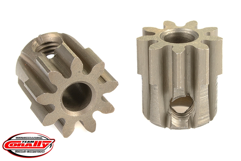 Krátké provedení, materiál tvrzená ocel, 9 zubů, modul ozubení 32DP. Pro hřídel motoru o průměru 3.17 mm (1/8 in). Pastorky TEAM CORALLY jsou vyráběny frézováním a následně tvrzeny, čímž je zajištěna vysoká přesnost ozubení. Všechny pastorky TEAM CORALLY jsou vyrobeny v EU.