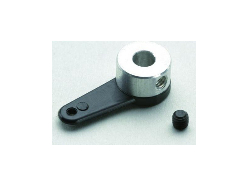 Páka řízení plastová 16mm s hliníkovým nábojem s otvorem o průměru 4mm a zajišťovacím červíkem M3. Celková délka 23,5mm, výška 7mm, náboj má průměr 9,5mm.