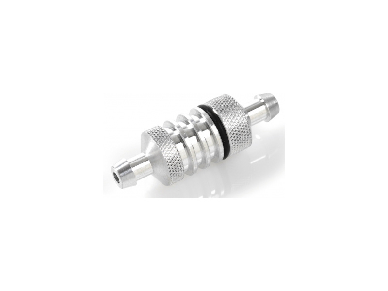 Palivový filtr car hliníkový s kovovým jemným sítkem. Rozměry: délka celk. 31mm, průměr 10mm, hadicová koncovka 5/4mm, délka těla filtru cca 18mm.
