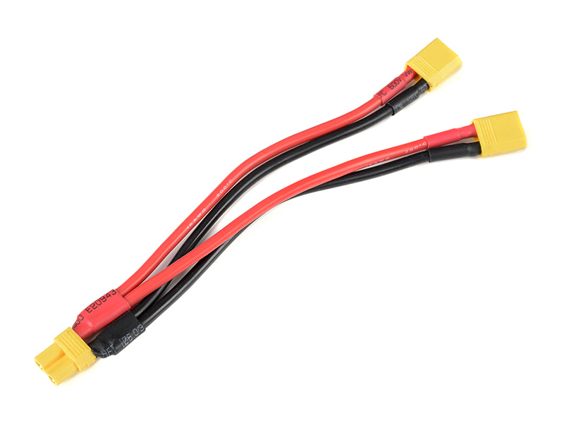 Paralelní Y-kabel s konektory XT-30 a kabely 14AWG, délka 12cm. Dva přístrojové (pro baterie) a jeden bateriový konektor (do regulátoru). Vedle sebe se mohou zapojovat pouze akumulátory stejného typu, stejného napětí a stejné kapacity!