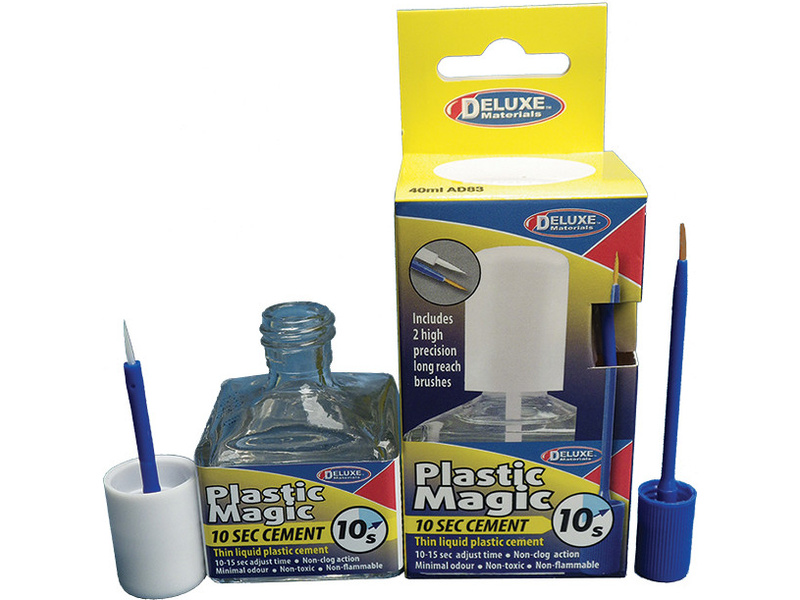 Novinka roku 2018 - populární lepidlo Deluxe Materials Plastic Magic nově s dobou tuhnutí 10 sekund. Lepidlo je netoxické, nedráždivé a díky době tuhnutí 10 sekund se hodí pro plastikové modelářství, modelovou železnici a podobně. Obsah 40 ml. Lepí plasty na bázi styrenu ((PS, HPS, PPS, naleptáním ploch.)