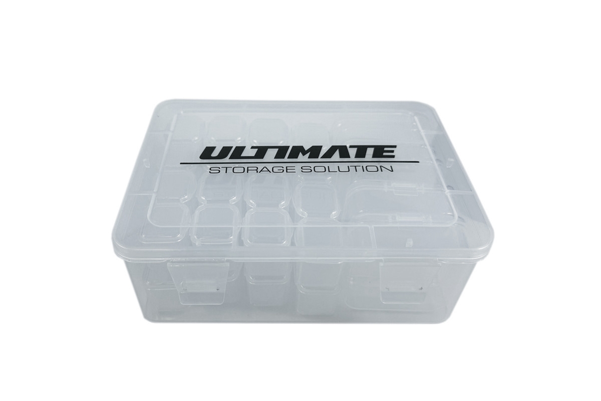 Pevný, odolný, průsvitný box o rozměrech 165x120x60 mm obsahuje 5 vnitřních boxů o rozměrech 55x55x20 mm a 32 boxů o rozměrech 24x20x24 mm se samostatným uzamykatelným víkem pro rychlé a snadné uložení dílů.