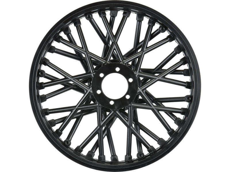 Disk předního kola Bullyspoke má silnější paprsky než standardní kola, aby se zabránilo ohýbání při tvrdých nárazech. Využívá styl V2 Bead společnosti Pro-Line, který má výhody jak ve snadném použití, tak v estetice. Díky širokému plochému 1/8 lepidlu ve stylu buggy je lepení pneumatik hračkou. Patky jsou směrovány ke středu ráfku kola. Namontujte si pneumatiky Pro-Line MX33 (PRO1022901) pro maximální vylepšení stylu a výkonu! Tato kola jsou lisována z vysoce kvalitního černého nylonu.