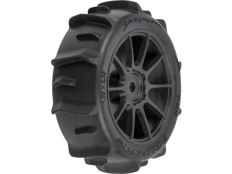 Kompletní kola Pro-Line pro RC modely aut 1:14 Typhon GROM. Rozměr ⌀72x26 mm. Disk Mach-10 má černou barvu. Pádlové pneumatiky Dumont 1.9". Unašeč je šestihran 12mm. Vložka Open Cell.