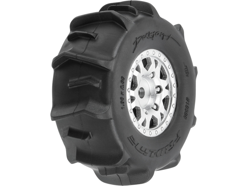 Kompletní kola Pro-Line pro RC modely aut 1:16 Mojave GROM. Rozměr ⌀66x26 mm. Disk má stříbrnou barvu. Pádlové pneumatiky Dumont 1.2". Unašeč je šestihran 12mm. Vložka Open Cell.