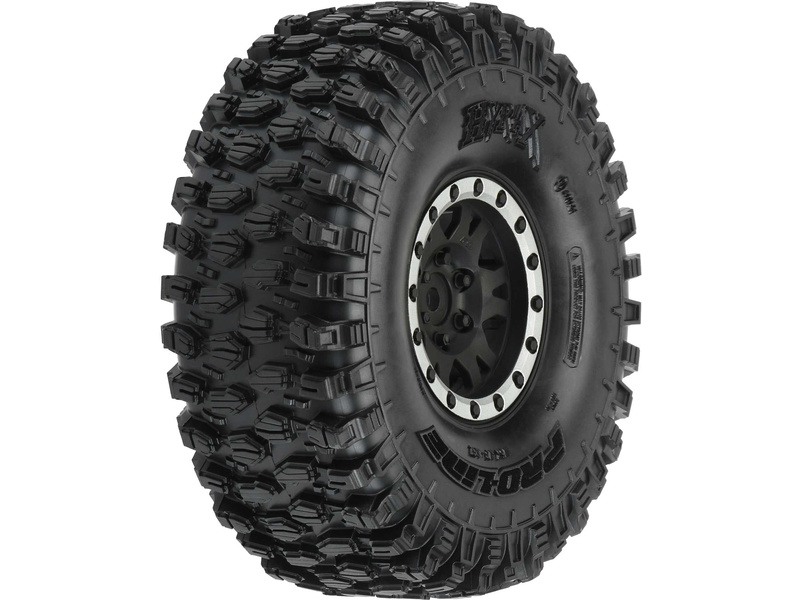 Kompletní kola Pro-Line pro RC modely aut 1:10 crawler, expediční. Rozměr ⌀120x45 mm. Paprskový disk Impulse má černou barvu, stříbrný kroužek. Pneumatiky Hyrax Predator 1.9", tvrdost směsi (extra měkká). Unašeč je šestihran 12 mm.