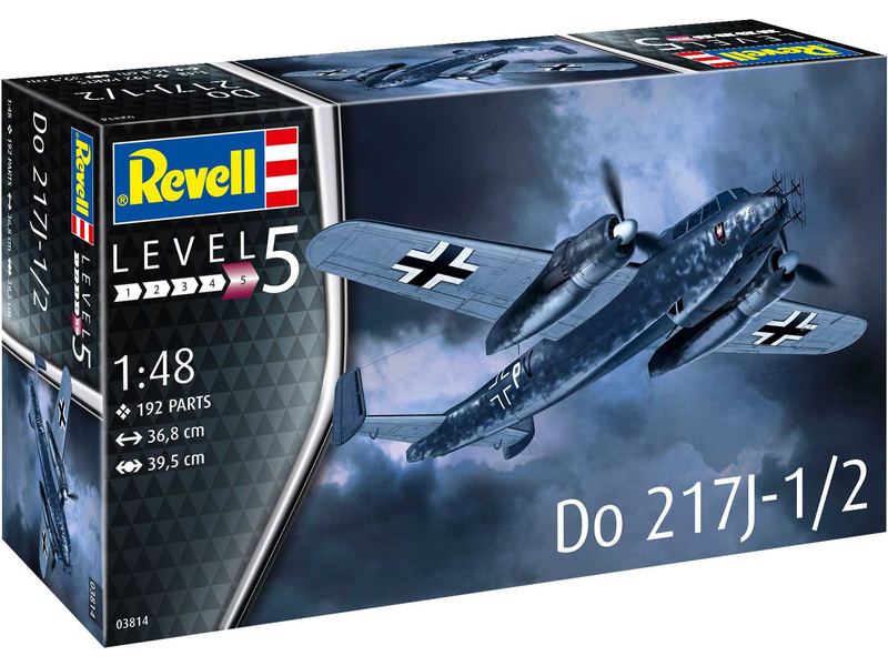 Plastikový model Revell 03814 – letadlo Dornier Do 217J-1/2 v měřítku 1:48 ke slepení. Stavebnice obsahuje 200 dílků, rozpětí křídel 395 mm, obtížnost 5.