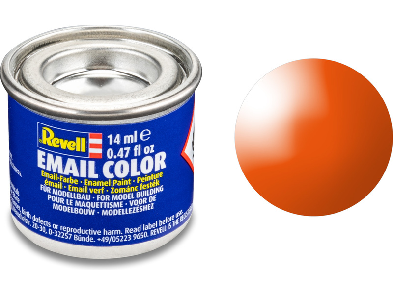 Syntetická (emailová) barva Revell 32130 pro použití v modelářství. Odstín číslo 30 – oranžová lesklá. Obsah 14 ml.