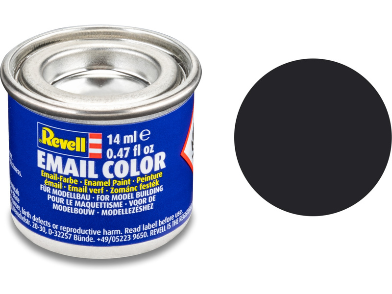 Syntetická (emailová) barva Revell 32106 pro použití v modelářství. Odstín číslo 6 – dehtově černá matná. Obsah 14 ml.