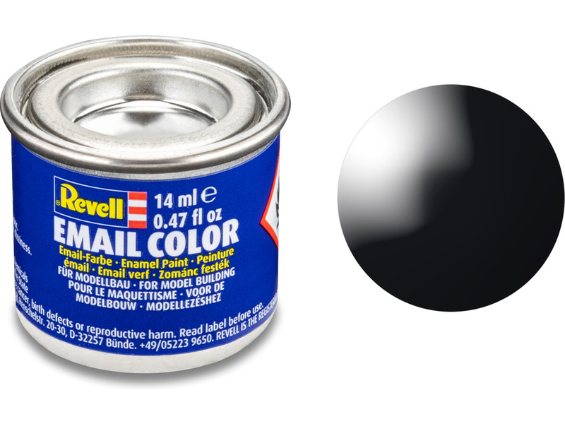 Syntetická (emailová) barva Revell 32107 pro použití v modelářství. Odstín číslo 7 – černá lesklá. Obsah 14 ml.