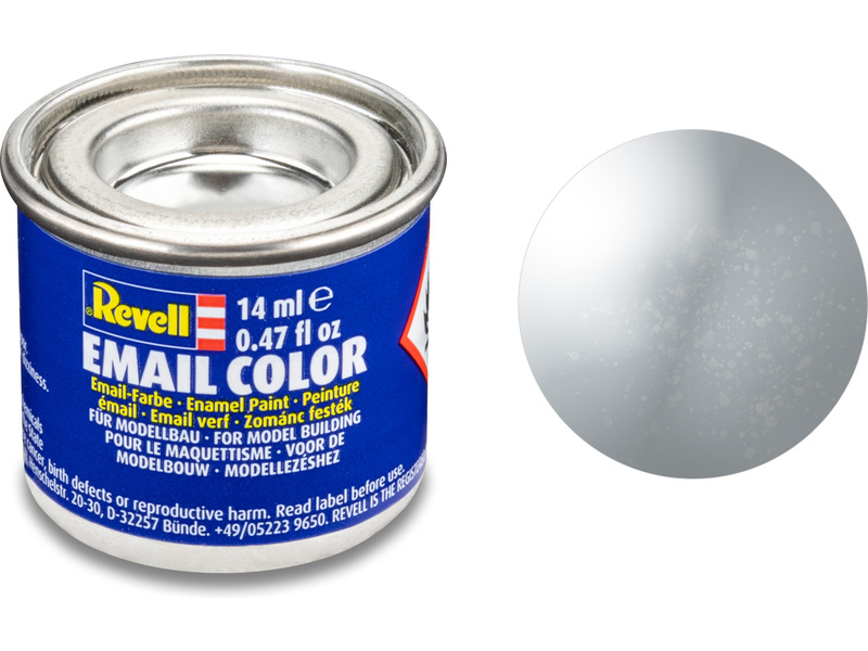 Syntetická (emailová) barva Revell 32190 pro použití v modelářství. Odstín číslo 90 – stříbrná metalická. Obsah 14 ml.