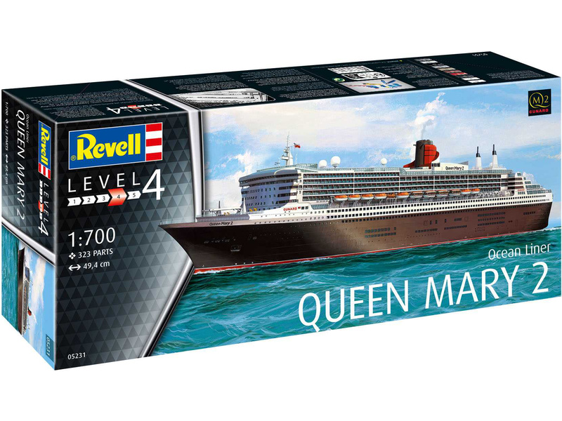 Plastikový model Revell 05231 – osobní parník Queen Mary 2 v měřítku 1:700 ke slepení. Stavebnice obsahuje 323 dílků, délka 494 mm, obtížnost 4.