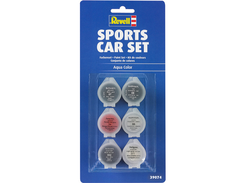 Sada šesti akrylových barev pro modeláře Revell 39072 Aqua Color nejčastěji používaných na sportovních autech. Barvy jsou po 5 ml.