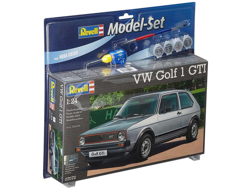 Plastikový model Revell 67072 – auto Volkswagen Golf 1 GTI v měřítku 1:24 ke slepení. Stavebnice obsahuje 121 dílků, lepidlo, štětec a barvičky, délka 154 mm, obtížnost 4.