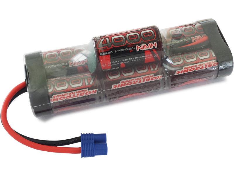 Kvalitní pohonný 7-článkový NiMH akumulátor Robitronic 8.4 V s kapacitou 4000 mAh a konektorem Deans / Tamiya pro RC modely aut. Vysoké provedení, rozměry 139 x 46 x 43 mm. Ideální pro RC modely aut Arrma 4x4 Mega.