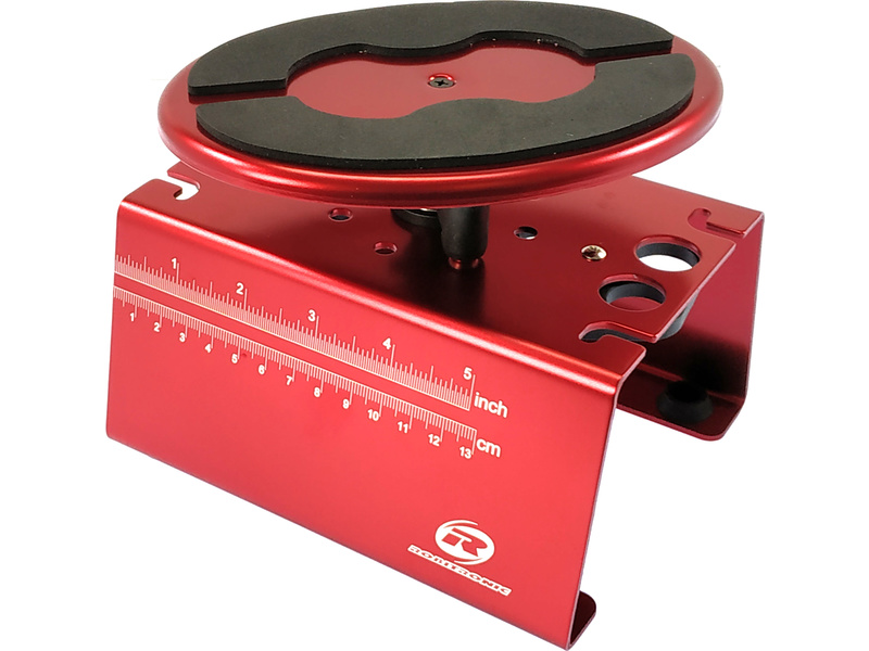 Praktický otočný stojan pro údržbu a opravy RC modelů aut v měřítku 1:8 až 1:10. Otočný stolek může být zafixován v 8 pozicích. Ve stojanu jsou dále přihrádky pro nářadí a stavitelné otvory pro sestavování tlumičů. Vyrobeno z červeně eloxovaného duralového plechu.