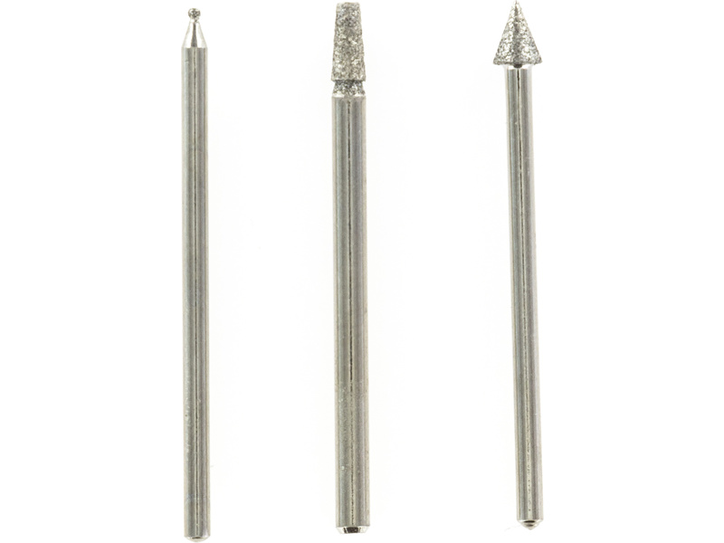 Rotacraft stopkové diamanové gravírovací nástroje (3ks) - kulička, kužel a komolý kužel, stopka do kleštiny 2,35mm. Vhodné na keramiku, kov, plast, dřevo a sklo. Ideální pro hobby, řemesla, elektroniku, restaurování, pro kutily a k renovaci.