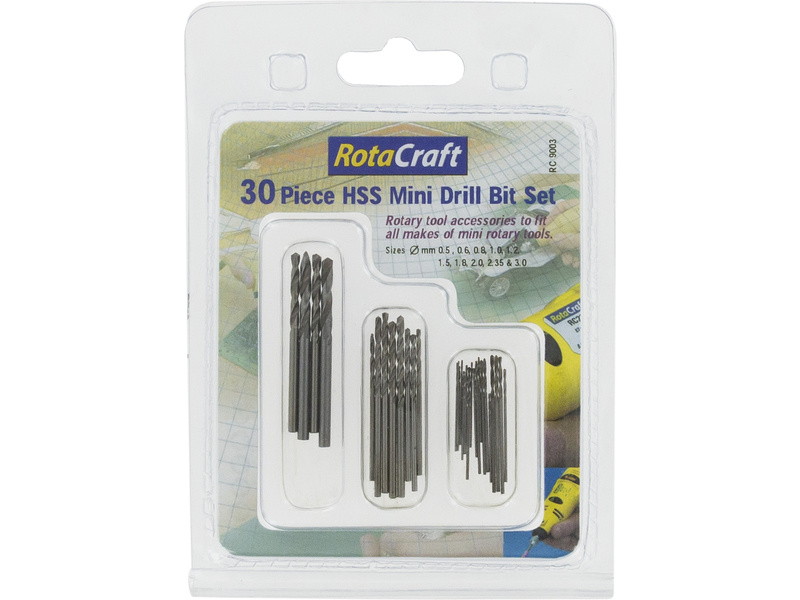 Rotacraft vrtáky HSS o průměru 0,5mm - 3mm (sada 30ks) v přehledné kazetě s označením průměru vrtáků. Rozměry: 0.5mm, 0.6mm, 0.8mm, 1mm, 1.2mm, 1.5mm, 1.8mm, 2mm, 2.35mm, 3mm.