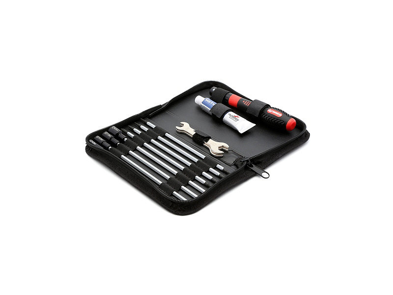 Sada nářadí Startup Tool pro lodě Proboat obsahuje sahu šroubováků s výměnnými nástavci: imbus 1,5, 2, 2,5 a 3 mm, nástrčné klíče 4, 5.5, 7, a 8 mm a křížové šroubováky 0, 00 a 1. Dále rukojeť s řehtačkou, ploché klíče 10 mm, 8 mm a tuk Marine 8ccm.