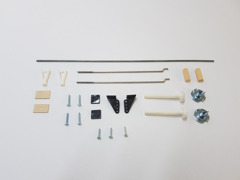 Sada příslušenství pro letadla obsahuje 2ks zapichovací matice M5, 2x plastový šroub M5 x 40mm, 2ks páka kormidla výška celk. 19mm, s podložkami a šrouby M2x12mm, 2ks vidlička plastová M2 o délce 20mm, 2ks oc. táhla se záv. M2x18mm a ohybem Z o celk. délce 110mm, ocelový drát 2mmx 220mm, 3ks vrtut 2x10mm, 2ks dřevěný kolík 6 15mm, 2ks překližka 1mm, 10x15mm.
