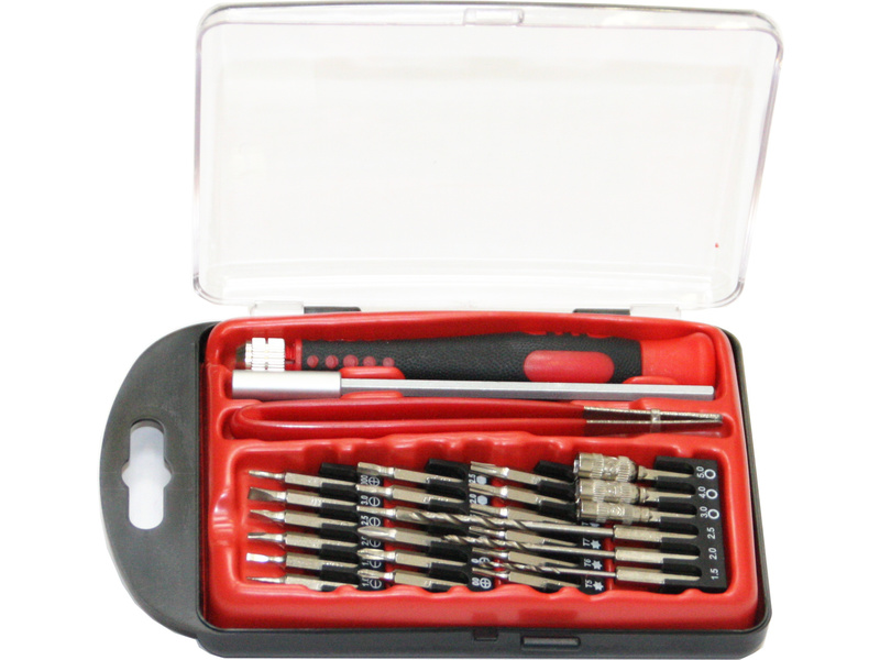 Sada nářadí obsahuje vše, co potřebujete k servisu vašeho modelu. Komplexní sada nástrojů v praktickém, odolném pouzdru. V balení pogumovaná ručka se sklíčidlem, které umožňuje nastavit libovolnou délku prodlužovacího nádstavce (až 110 mm), pogumovaná pinzeta a velké množství nástavců.