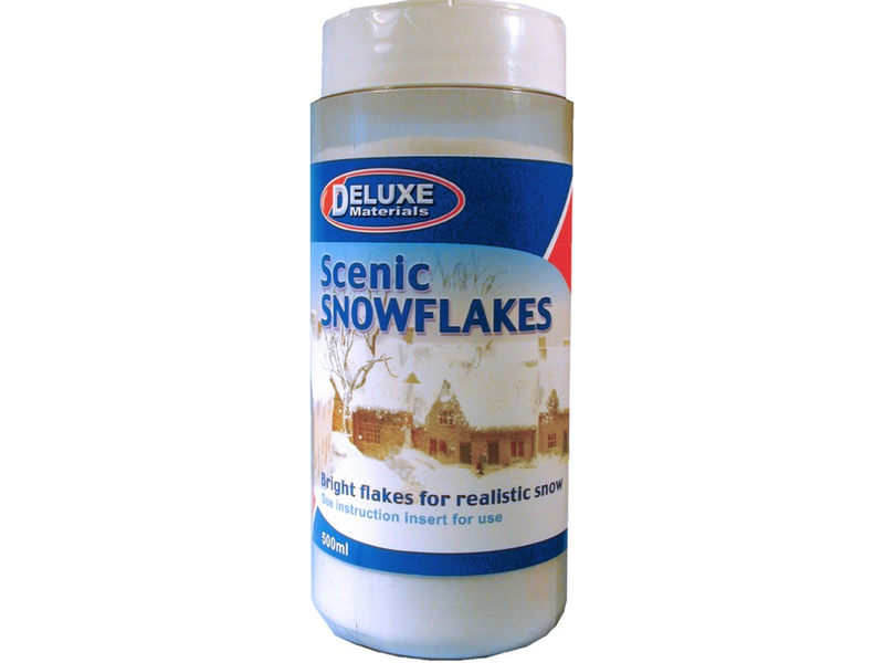 Scénické sněhové vločky 500ml slouží k vytvoření realistického sněhového povrchu pro modelovou železnici a dioramata. Umožňuje snadno vytvářet skutečné sněhové efekty jako je napadaný sníh na budovách, stromech, vegetaci atd.